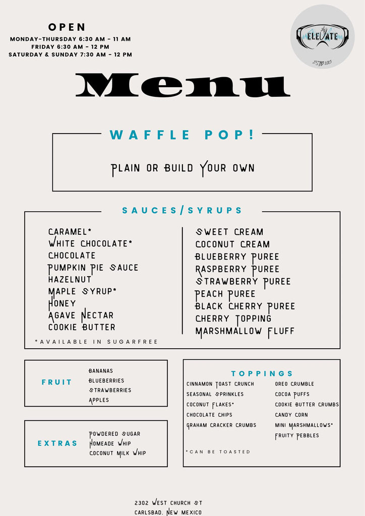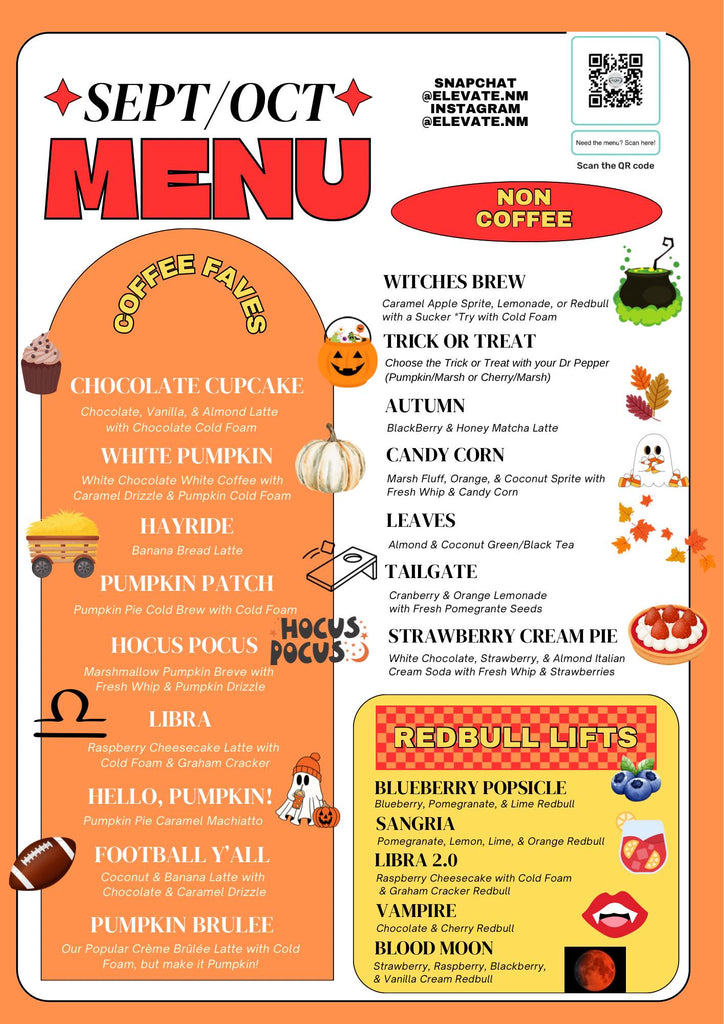 Elevate specializes in Craft Coffee, Mocktails, Fresh Lemonades, Redbull Lifts, Italian Cream Sodas, & a variety of Teas! We have certain drinks that can be made decaf and sugar free options. We are also trying to perfect our own Cold Brew! Some of these drinks are served in our Signature Cans, along with our own Michelada Mixes in different flavors. We make them ourselves, including our homemade Chamoy flavors as an option.